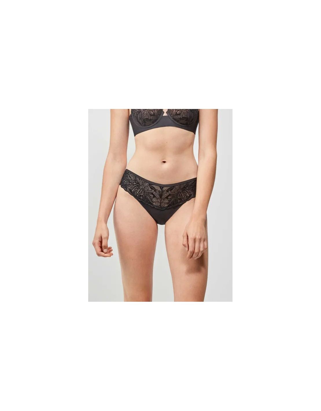 Braga corte en V clásica que estiliza la figura con detalle de tul flocado en la cintura.
