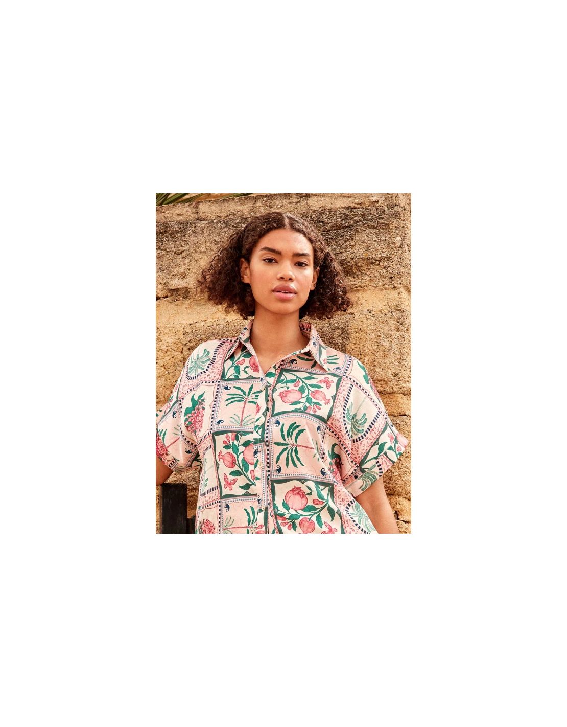 Camisa manga corta satén estampado mosaico floral tropical