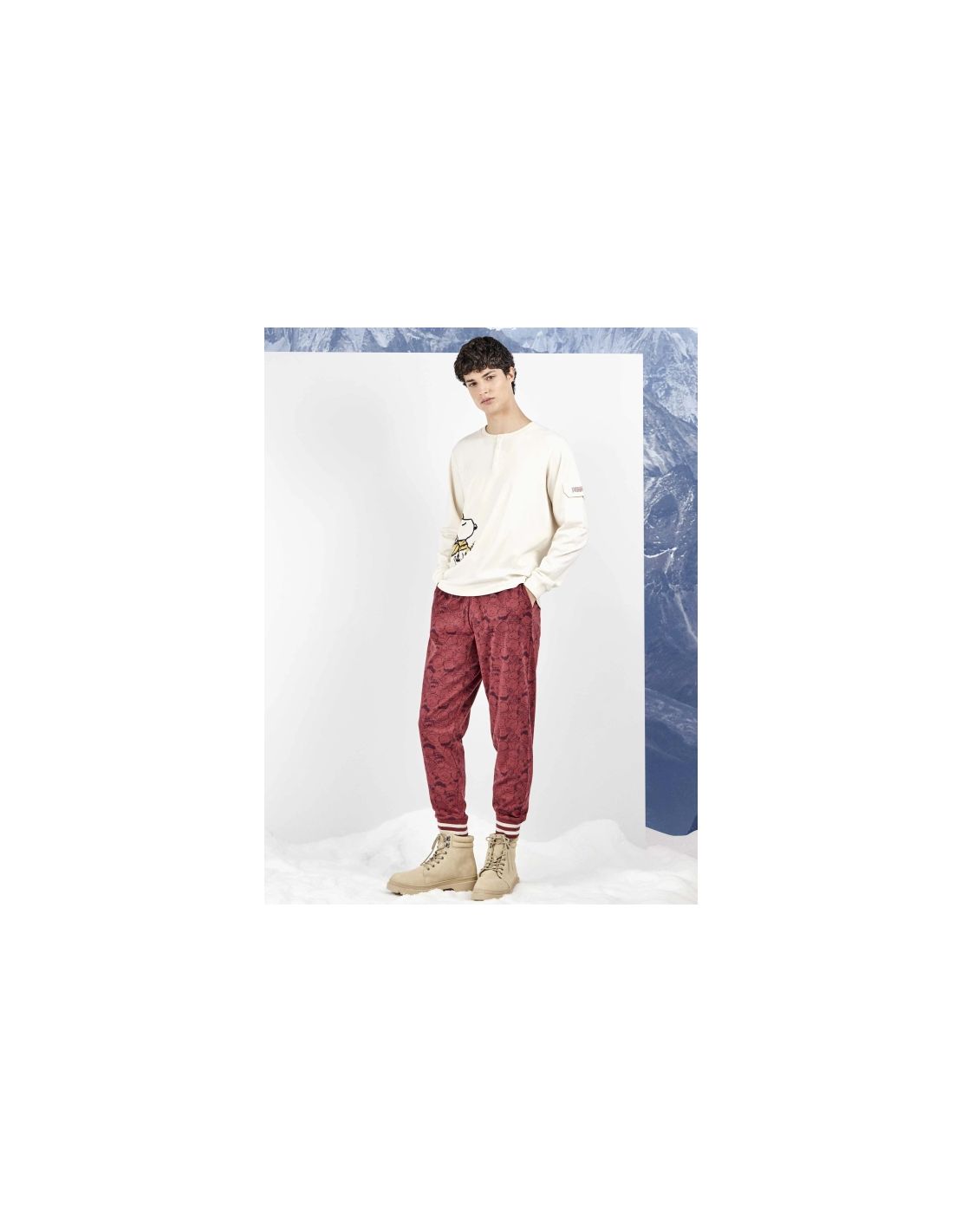 Pijama de hombre de Snoopy confeccionado en tejido de punto interlock. Camiseta de manga larga, cuello caja, tapeta con cierre de botones, bolsillo en manga con detalle estampado y mangas con terminación en puño. Pantalón estampado tono sobre tono a juego, incluye cinturilla elástica con cordón ajustable, bolsillos laterales y puños en tejido de canalé, proporcionando un ajuste cómodo y agradable. Opciones a conjunto para toda la familia.
