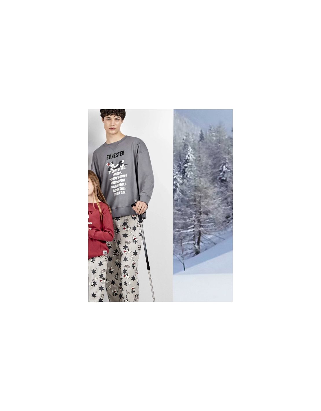 Pijama confeccionado en tejido de punto interlock. Camiseta de manga larga, con texto en parte delantera posicionado y flocado de 'Silvester', cuello caja y detalle triangular a contraste, y mangas con terminación en puño. Pantalón estampado a juego, incluye cinturilla elástica con cordón ajustable y terminación de puños en el bajo. Opciones a conjunto para toda la familia.