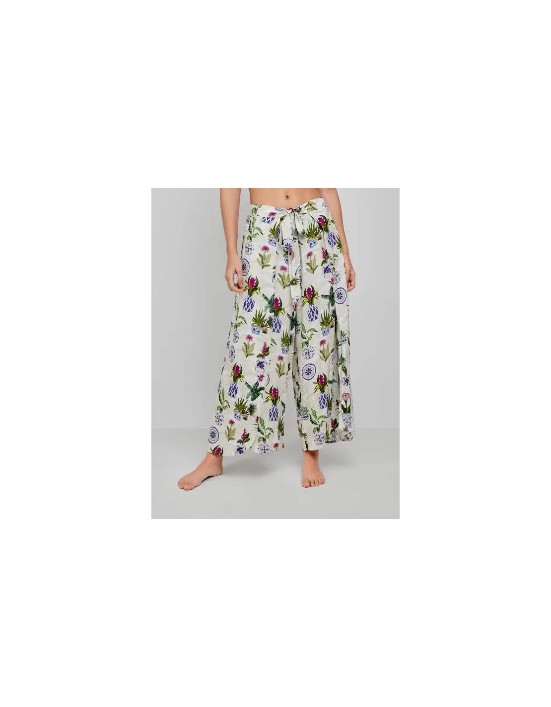 Falda pantalón en tejido estampado tropical y anudado al frente. Combínalo con sus bikinis y bañadores a juego.