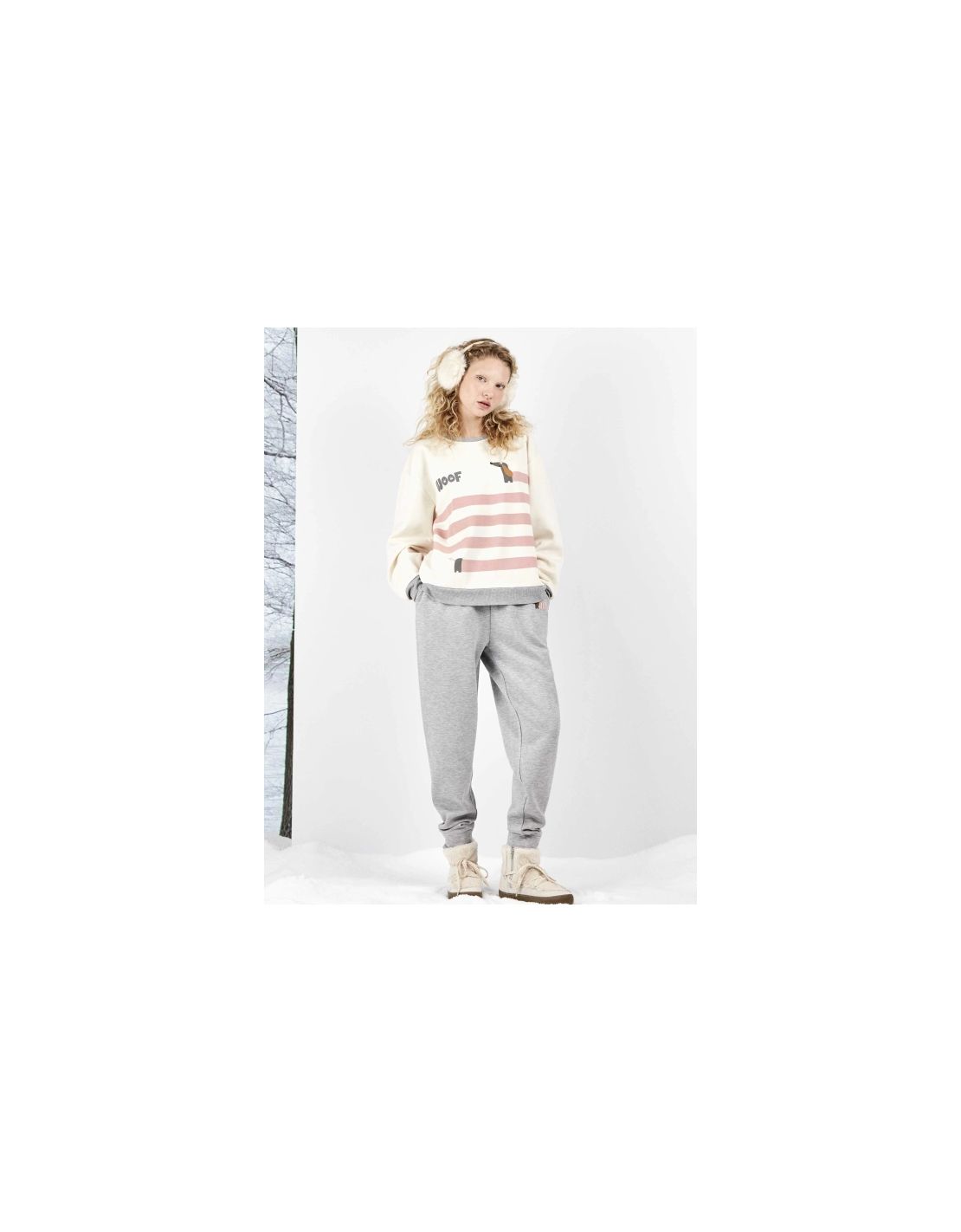 Pijama confeccionado en tejido de felpa elástica. Camiseta de manga larga, con estampado posicional de perrito salchicha que se transforma en rayas, con texto posicionado en el pecho y letras adicionales en la espalda. Cuello, puños y cintura con acabado en rib. Pantalón largo liso a juego, con detalle de estampado posicional de perrito salchicha, cinturilla en rib con cordón ajustable a contraste, puños en el bajo y bolsillos laterales para mayor comodidad. Combina suavidad y estilo para momentos de relax. Opciones a conjunto para toda la familia.