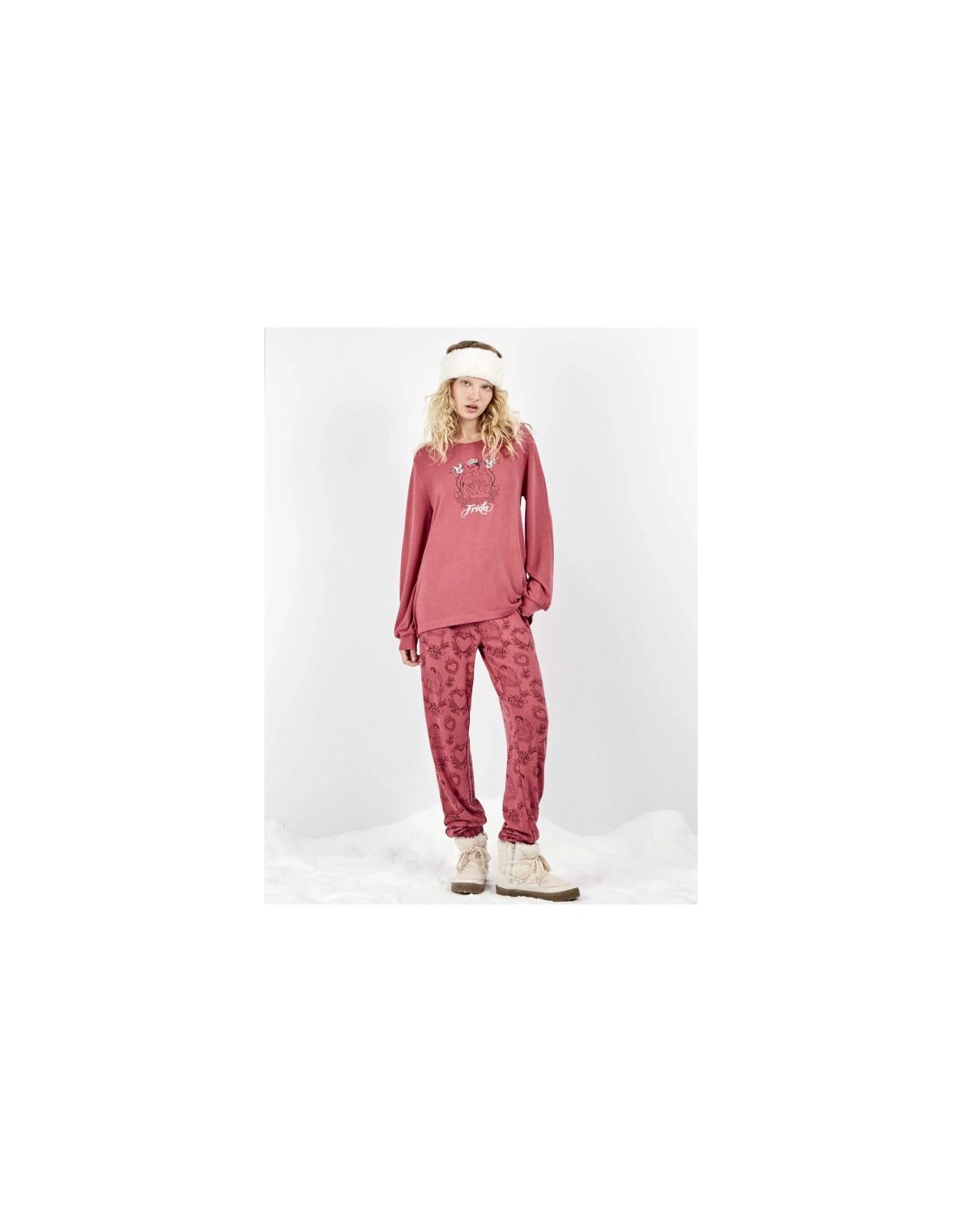 Pijama confeccionado en tejido de punto all over. Camiseta de manga larga, cuello caja, mangas abullonadas con terminación en puño y estampado posicional en centro delantero con motivo de Frida Kahlo. Pantalón a juego, con estampado tono sobre tono y cinturilla y puños en el bajo elásticos. Prenda cómoda y estilosa, perfecta para estar en casa.