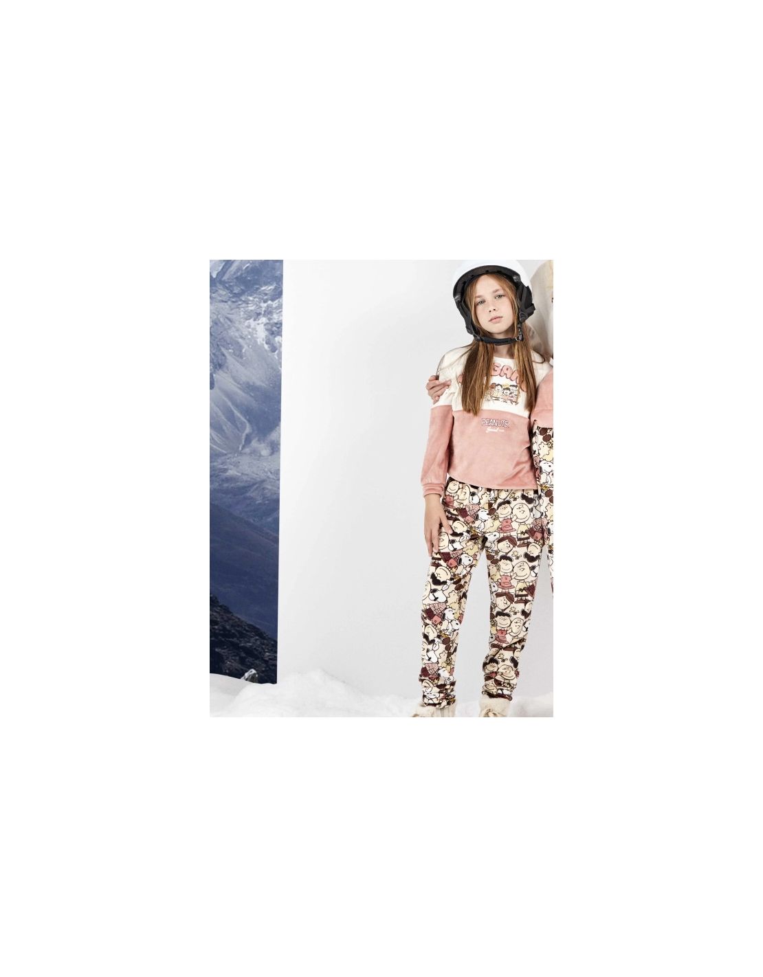 Pijama kids de Snoopy confeccionado en tejido de polar elástico. Camiseta con corte de color a contraste, de manga larga acabada en puño, con detalle de etiqueta, estampado Snoopy posicionado en centro delantero y cuello caja. Pantalón largo estampado a juego, incluye cinturilla ajustable con cordón, bolsillos laterales y puños en el bajo, aportando comodidad y estilo en los momentos de descanso.