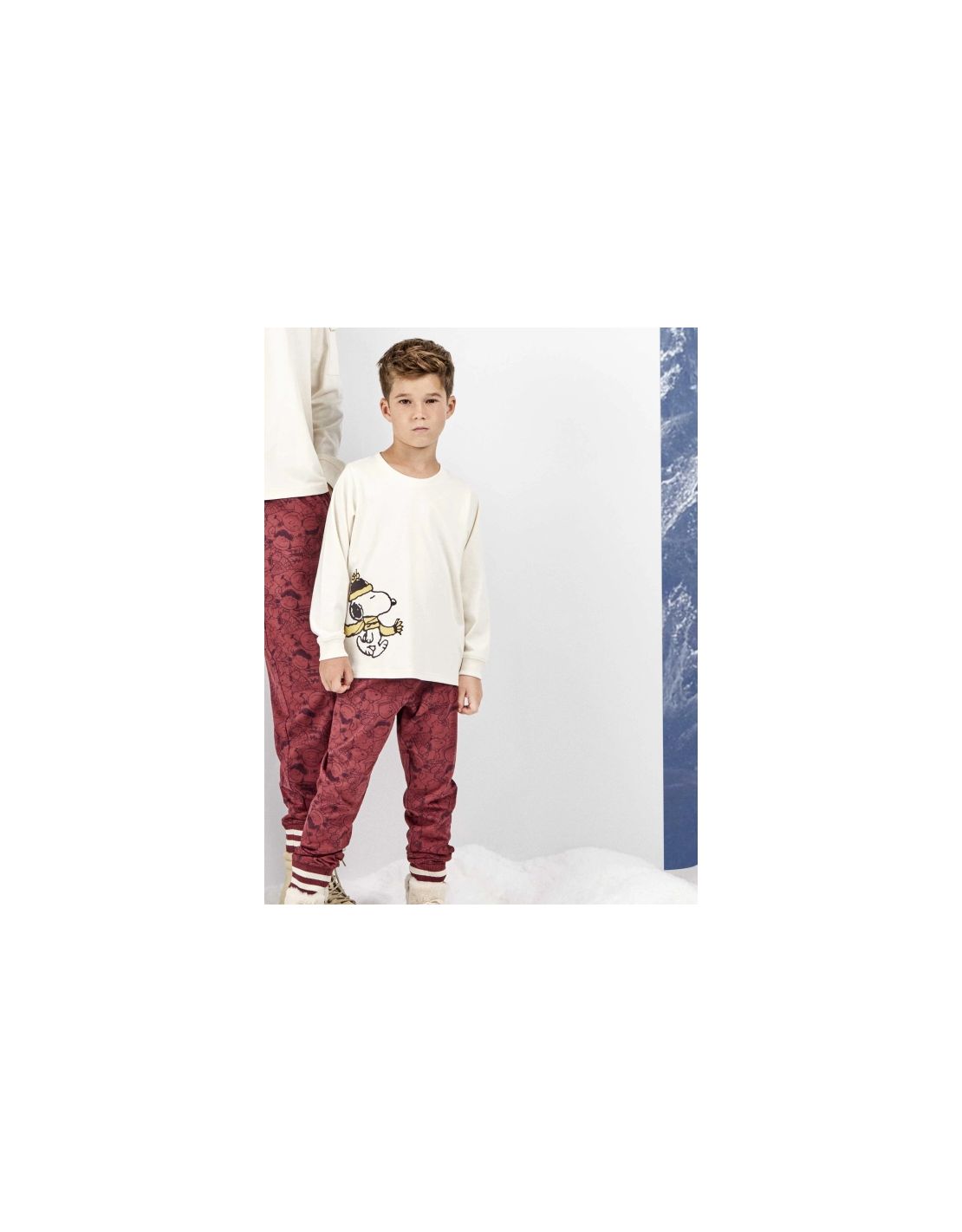 Pijama kids de Snoopy confeccionado en tejido de punto interlock. Camiseta de manga larga con terminación en puño, estampado Snoopy posicionado en delantero y espalda, y con cuello caja. Pantalón largo estampado tono sobre tono a juego, con cinturilla elástica, bolsillos laterales y puños en canalé, proporcionando un ajuste cómodo y agradable. Opciones a conjunto para toda la familia.