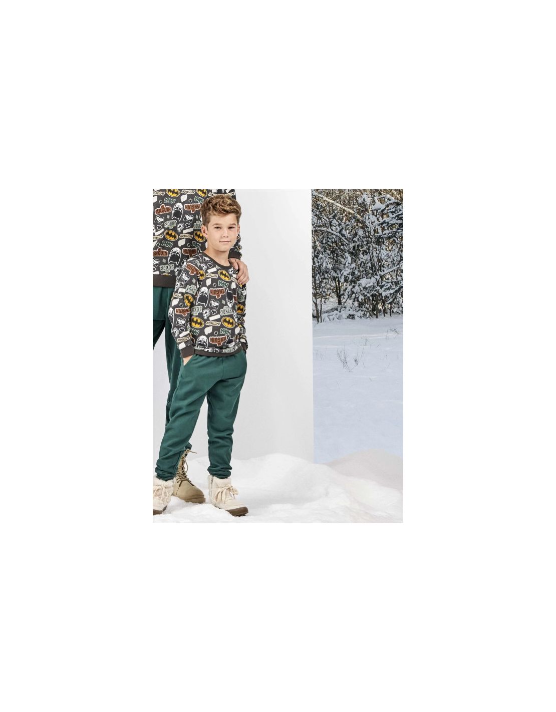 Pijama kids confeccionado en tejido de felpa. Camiseta de manga larga con rib en puños, cuello y cintura y estampado Batman. Pantalón largo liso a conjunto, incluye cinturilla elástica con cordón ajustable y puños en el bajo para mayor comodidad y sujeción. Diseño cálido, ideal para noches de invierno. Opciones a conjunto para toda la familia.