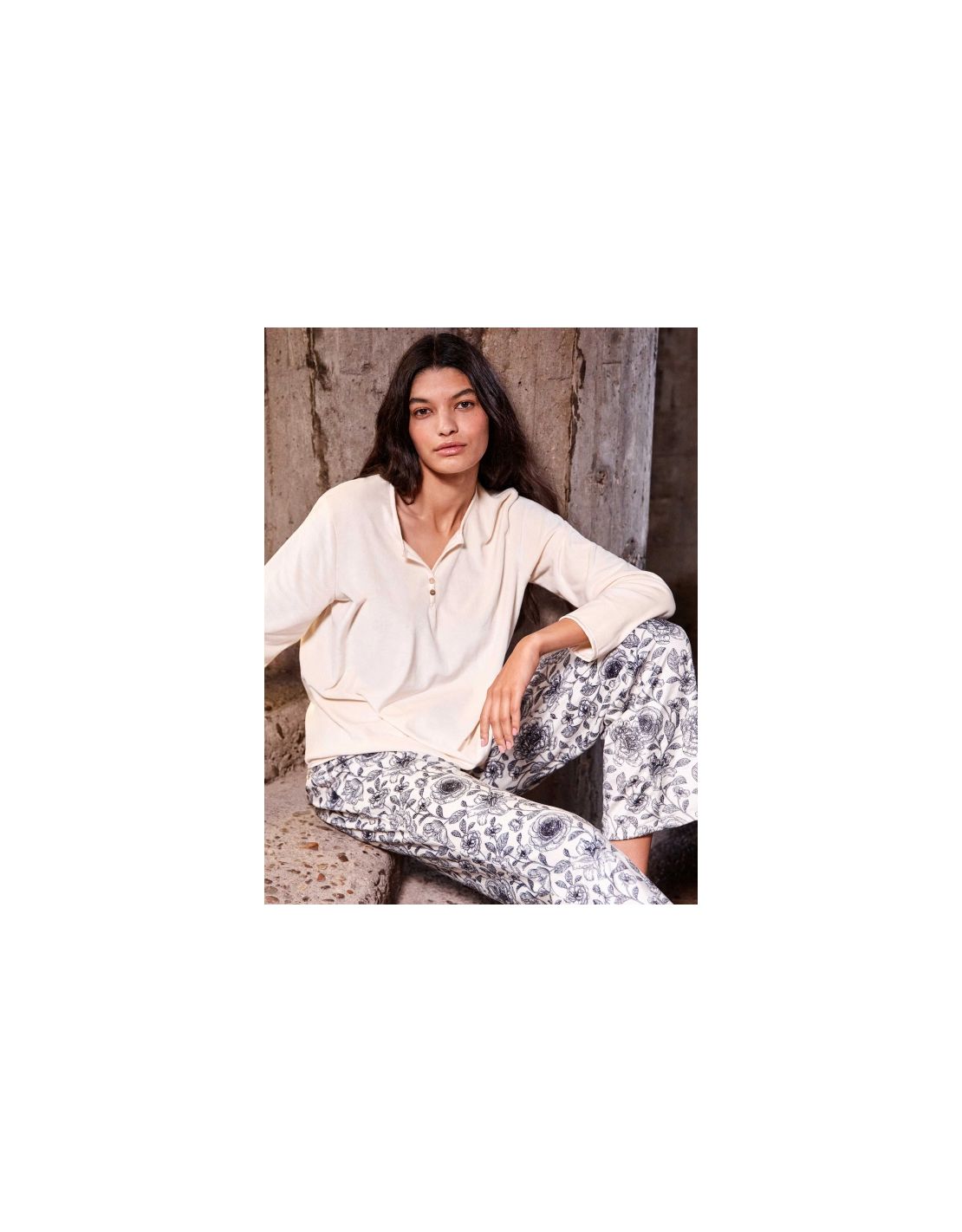 Pijama con camiseta y pantalón largo, confeccionados en tejido polar elástico. La camiseta cuenta con cuello en pico. Detalle en escote, cintura y puños de vivos satinados que aportan sofisticación. El pantalón largo estampado a juego, tiene cinturilla elástica y cordón satinado ajustable. Diseñado para ofrecer comodidad y calidez durante el invierno.