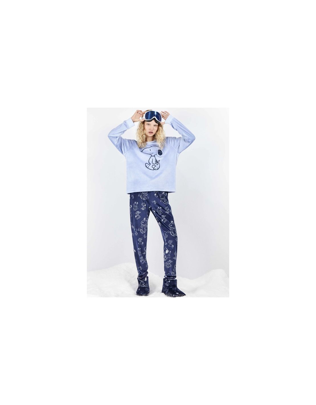Pijama de Snoopy confeccionado en tejido de polar elástico. Camiseta de manga larga, con cuello caja, bordado de Snoopy posicionado en el delantero con detalle de relieve y puños en rib. Pantalón estampado a juego, incluye cinturilla elástica ajustable con cordón y puños en rib para mayor ajuste. Diseño versátil y cómodo para el día y la noche.