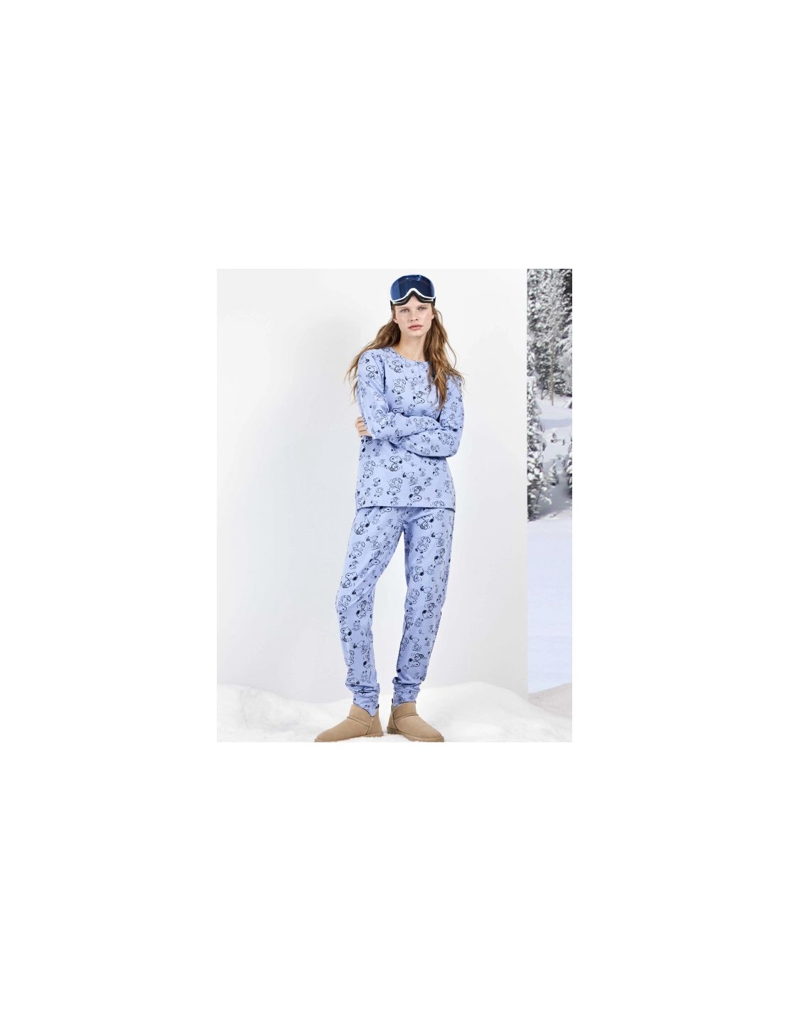 Pijama de Snoopy confeccionado en tejido de algodón con elastano. Camiseta de manga larga, cuello caja con cierre de botones y estampado tono sobre tono de Snoopy. Pantalón a juego con el mismo estampado, incluye cinturilla con elástico de Snoopy y puños en el bajo para mayor ajuste y comodidad. Aporta confort y estilo.