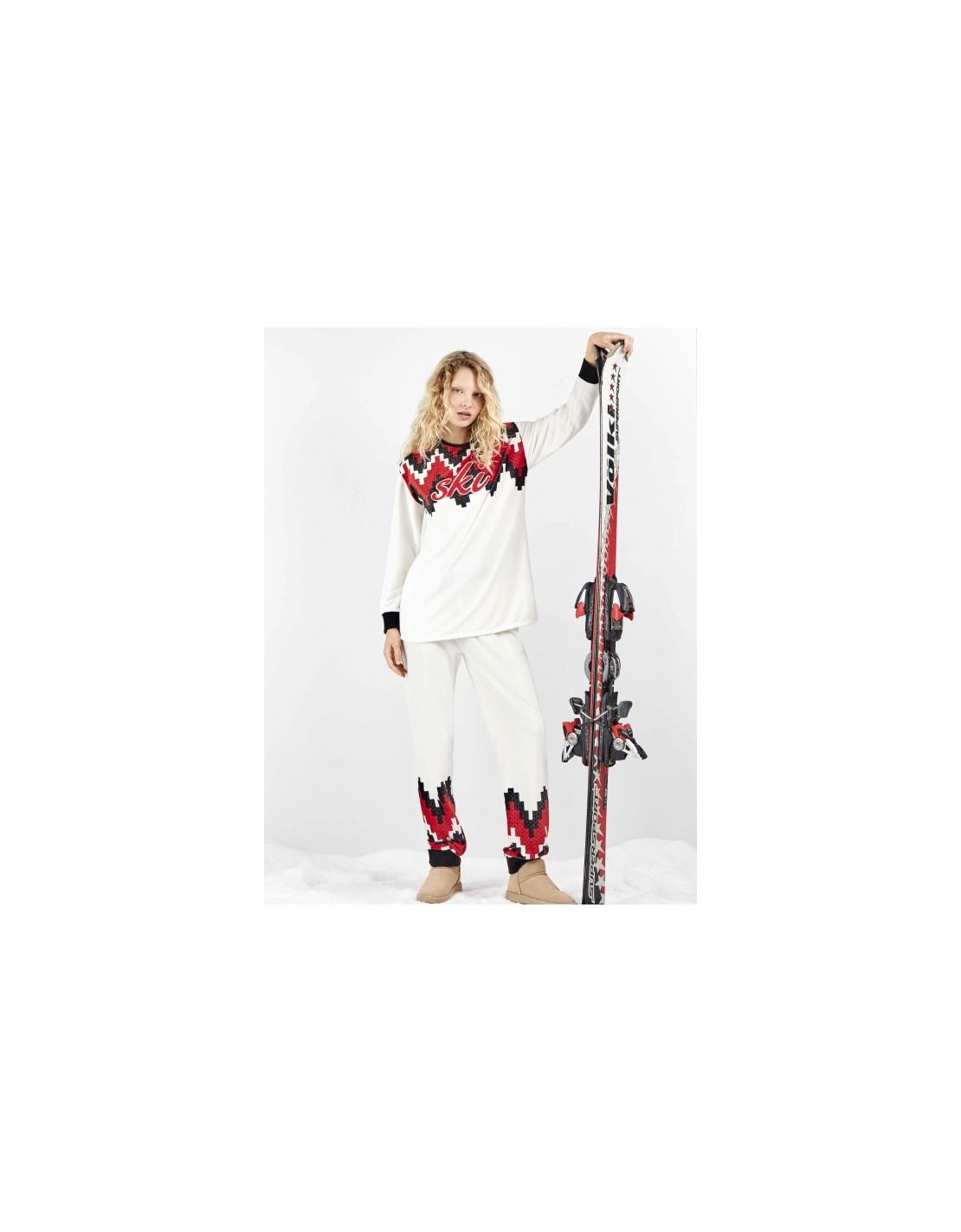 Pijama confeccionado en tejido polar elástico. Camiseta de manga larga, con estampado geométrico y texto 'ski' bordado y posicionado. Pantalón largo, con estampado posicionado en el bajo, incluye puños y cinturilla en canalé con cordón ajustable. Look retro-après ski. Ideal para un outfit con estilo y confort en invierno.