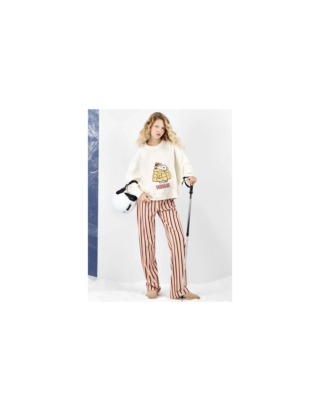 Pijama de Snoopy confeccionado en tejido de punto interlock. Camiseta con sisa caída y detalle de tejido de canalé a contraste en cuello, puños, costados y contura. Presenta estampado bordado posicional de Snoopy en centro del delantero. Pantalón recto de rayas verticales a juego, incluye cinturilla con cordón ajustable para un look cómodo y abrigado para momentos de descanso. Opciones a conjunto para toda la familia.