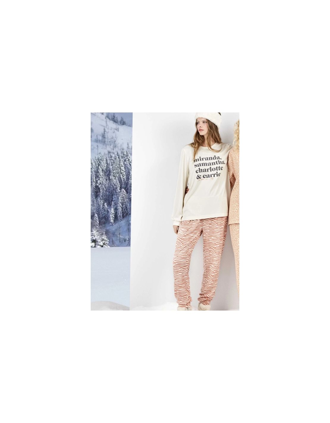 Pijama confeccionado en tejido de punto. Camiseta de manga larga con terminación en puño, con estampado de texto posicional Sex and The City en centro delantero y cuello caja. Pantalón largo con estampado de animal print a juego, incluye cinturilla y puños elásticos en el bajo para mayor ajuste. Diseño perfecto para estar en casa con estilo y comodidad.