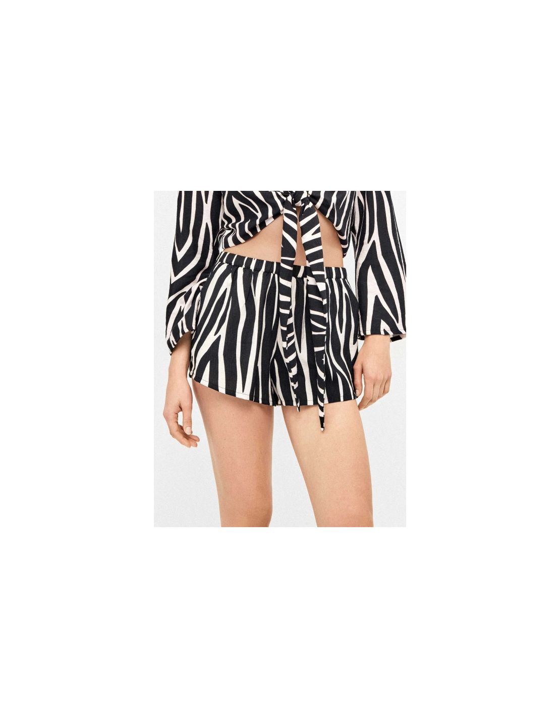 Short corto con bolsilos y cintura elástica. Tejido fluído de estampado animal print cebra.