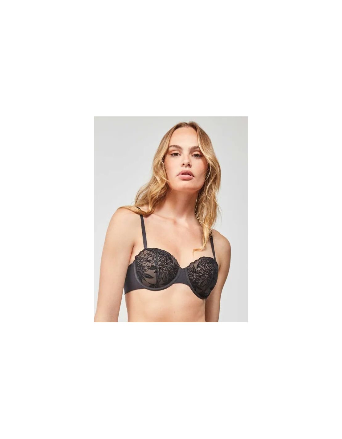 Sujetador bandeau desmontable con aro y foam. Confeccionado en encaje y detalle florales. Cierre trasero de cuatro posiciones y disponible en copas B y C.