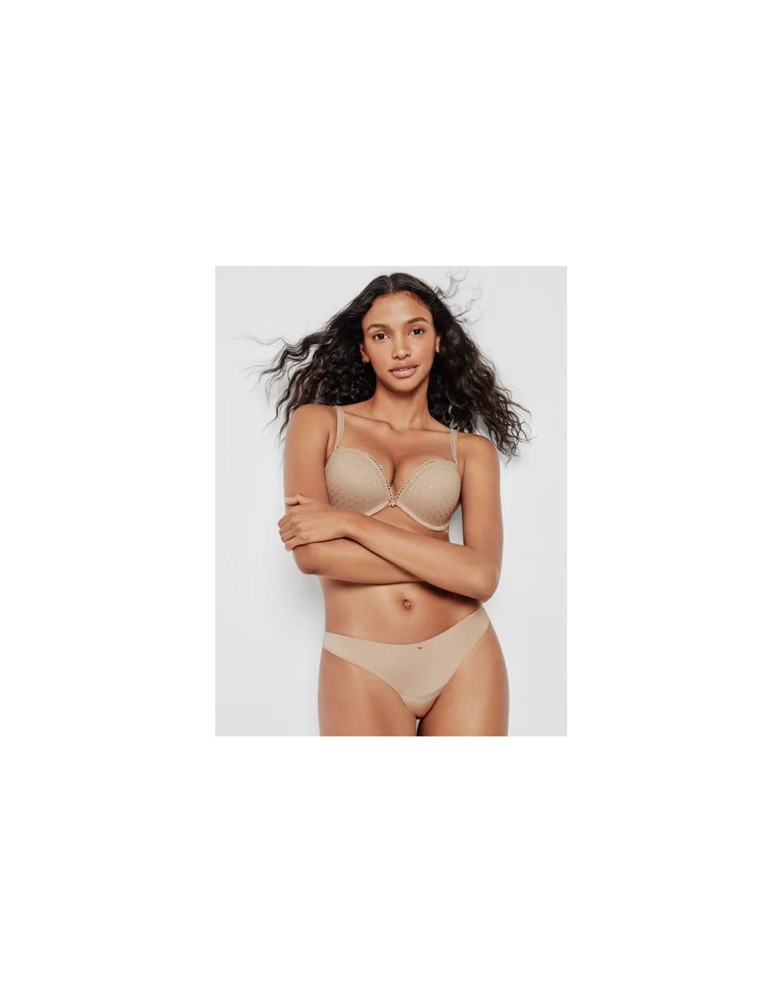 Sujetador push up +2 plus con aro y estampado de topos. Tirantes regulables que incluyen enganche para poder cruzarlos. Detalle de galón de encaje en escote y lazo en el centro. Cierre de cuatro posiciones. Disponible en tres colores.