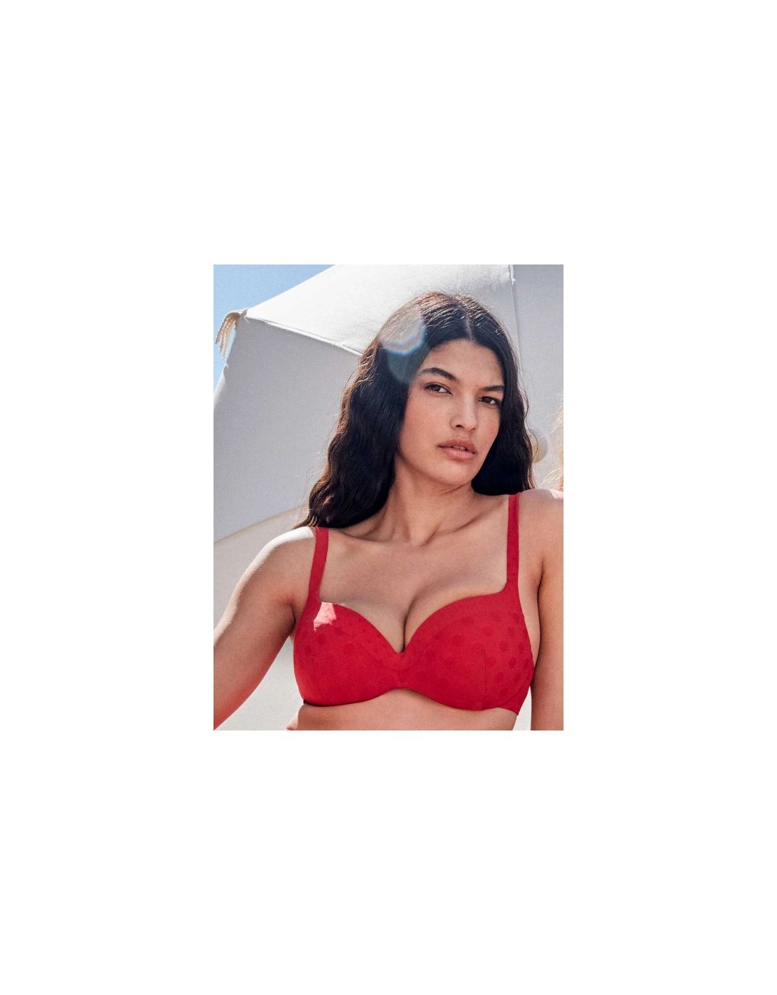 Top bikini con copas y aros integrados que hacen que la prenda sea súper cómoda. Tejido con jacquard textura de puntos. Espaldilla regulable que permite adaptarla a varias copas. Disponible en copas B y C. Combínalo con su braguita bikini a juego.