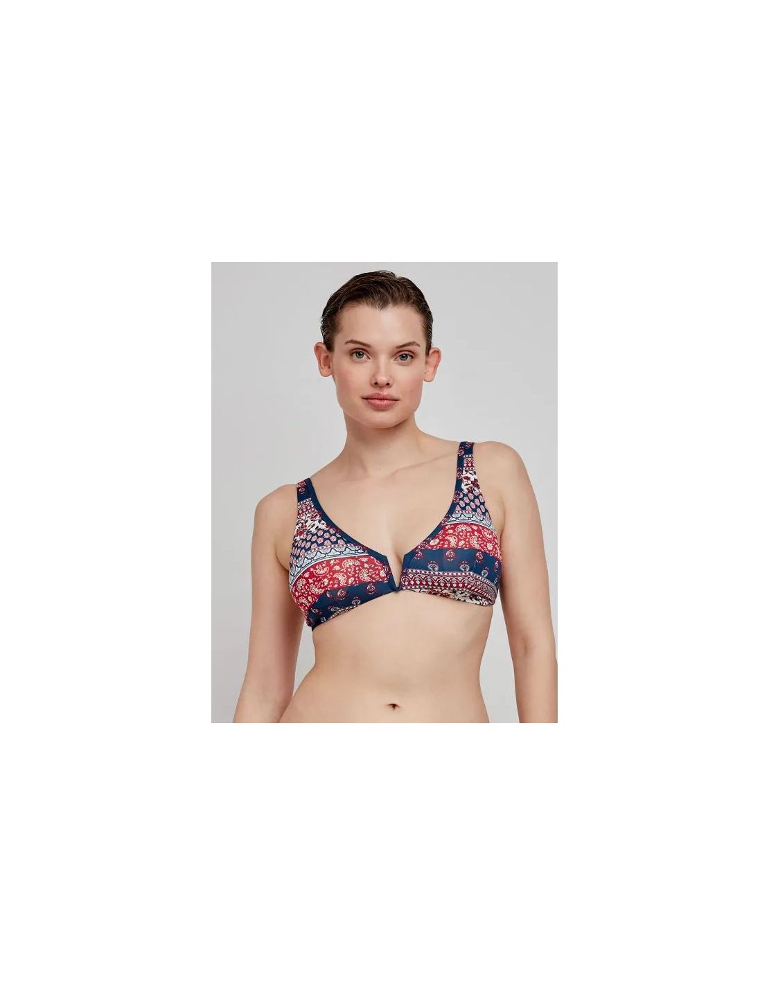 Top bikini capacidad reversible sin aro en tejido estampado étnico. Tirantes regulables y detalle de pieza en escote. Combínalo con su braguita bikini a juego.