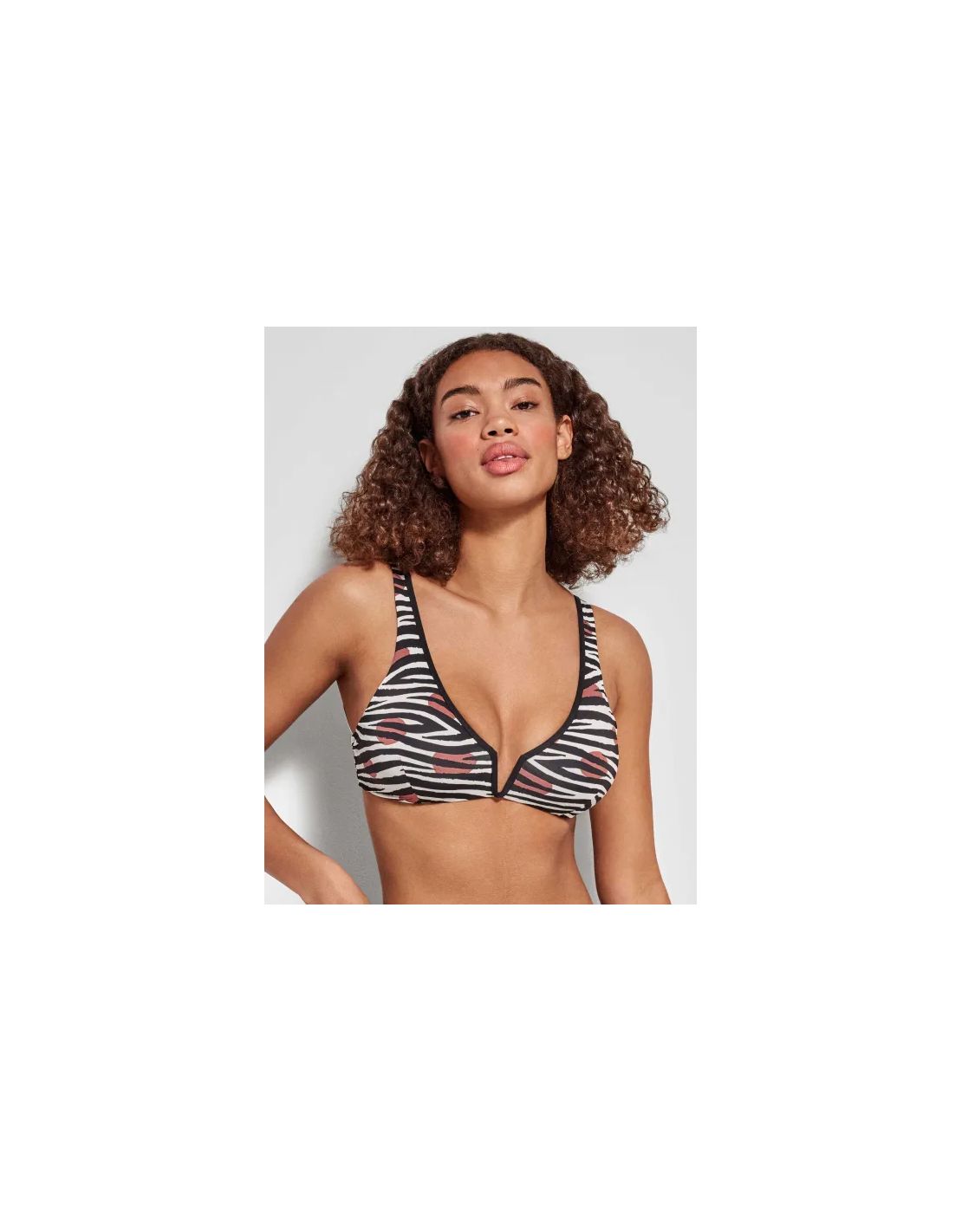Top bikini sin aro y con foam extraíble en tejido estampado savannah. Tirantes regulables y cierre trasero. Combínalo con su braguita bikini a juego.